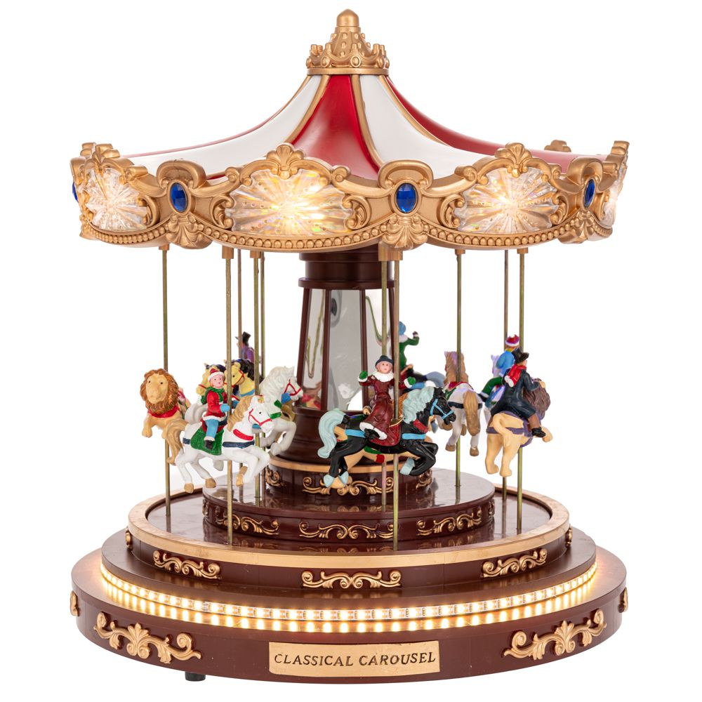 Χριστουγεννιάτικο καρουζέλ σε καφέ χρώμα. Η περίτεχνη κατασκευή του κοσμείται από χρυσές λεπτομέρειες καθώς και περιμετρικά led λαμπάκια στη βάση του. Στο κέντρο έχει μια διακοσμημένη κολώνα και γύρω γύρω γυρνάνε ανεβοκατεβαίνοντας χαρούμενες φιγούρες απο παιδάκια πάνω σε αλογάκια και λιονταράκια. Παίζει μουσική η οποία έχει κουμπί On/Off. Λειτουργεί με ρεύμα με μετασχηματιστή 4.5V ο οποίος περιέχεται. Υλικό κατασκευής πολυρεζίνη και πλαστικό. Πολύ καλή απεικόνιση και ποιότητα κατασκευής. Τo προιόν μπορεί να έχει μικρές χρωματικές διαφορές απο την φωτογραφία.