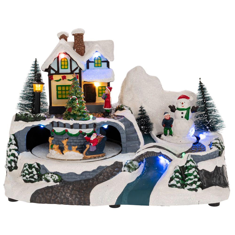 Χριστουγεννιάτικο φωτιζόμενο σκηνικό με Άγιο Βασίλη που κινείται μέσα σε έλκηθρο μπροστά από ένα φωτιζόμενο σπίτι. Λειτουργεί με 3 μπαταρίες ΑΑ οι οποίες δεν περιέχονται. Υλικό κατασκευής πολυρεζίνη και πλαστικό. Πολύ καλή απεικόνιση και ποιότητα κατασκευής. Τo προιόν μπορεί να έχει μικρές χρωματικές διαφορές απο την φωτογραφία.